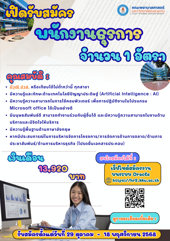 ขอประชาสัมพันธ์การรับสมัครงาน ตำแหน่งพนักงานธุรการ จำนวน 1 อัตรา เปิดรับสมัครตั้งแต่วันที่ 29 ต.ค. – 18 พ.ย. 68 สามารถดูรายละเอียดตามเอกสารที่แนบมาพร้อมนี้