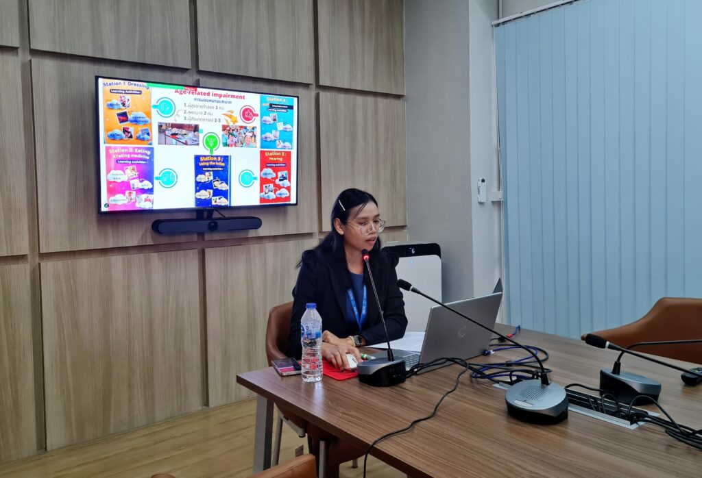 กิจกรรมในครั้งนี้ ได้รับเกียรติจาก อาจารย์จุฑามาศ โสมณวัฒน์ อาจารย์ประจำสาขาวิชาการพยาบาลผู้สูงอายุ ร่วมเป็นวิทยากรแบ่งปันประสบการณ์งานวิจัยในหัวข้อ “ผลของการเตรียมความพร้อมก่อนฝึกปฏิบัติการพยาบาลผู้สูงอายุด้วยบทบาทสมมติ และสถานการณ์จำลองต่อความมั่นใจในการฝึกปฏิบัติการพยาบาลผู้สูงอายุ และความพึงพอใจของนักศึกษาพยาบาล” ซึ่งเป็นงานวิจัยที่ใช้ทฤษฎีการเรียนรู้จากประสบการณ์ของคอล์บ (Kolb) ผ่าน 2 กิจกรรมหลัก คือ บทบาทสมมติ (Age Related Impairment) 5 ฐาน เพื่อสร้างความเข้าใจข้อจำกัดทางกายภาพ และสถานการณ์จำลองทางคลินิก (Simulation) 4 ฐาน เน้นกลุ่มอาการสูงอายุ (Geriatric Syndromes) เช่น ภาวะสับสน (Delirium) ภาวะกลั้นปัสสาวะอุจจาระไม่ได้ (Incontinence) ความสามารถบกพร่อง (Inability) ภาวะโภชนาการ (Inanition) และ การพลัดตกหกล้ม (Instability)
