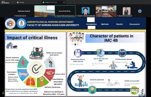 ในการนี้ อาจารย์จักรินทร์ สมณะ อาจารย์ประจำสาขาวิชาการพยาบาลผู้สูงอายุ ได้ร่วมแชร์ประสบการณ์การทำวิจัยเรื่อง Effects of a nursing program to early promote the activity of daily living after passing critical conditions among older adults admitted to semi-medical intensive care units: A quasi-experimental study” ซึ่งได้รับความสนใจจากบุคลากรและนักวิจัยที่เข้าร่วมกิจกรรมทั้งในรูปแบบ On-site และ Online