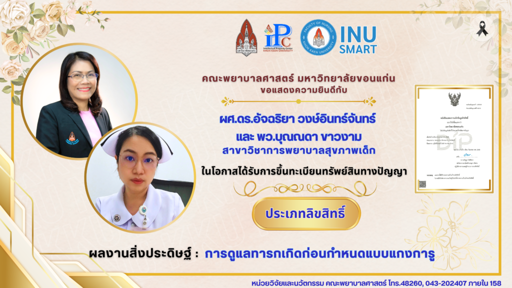 คณะพยาบาลศาสตร์ มหาวิทยาลัยขอนแก่น ขอแสดงความยินดี แก่ ผศ.ดร.อัจฉริยา วงษ์อินทร์จันทร์ และ พว.บุณณดา ขาวงาม