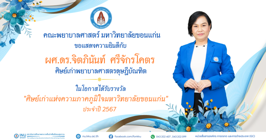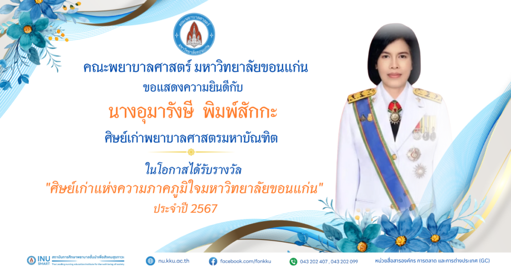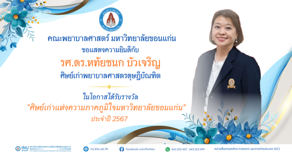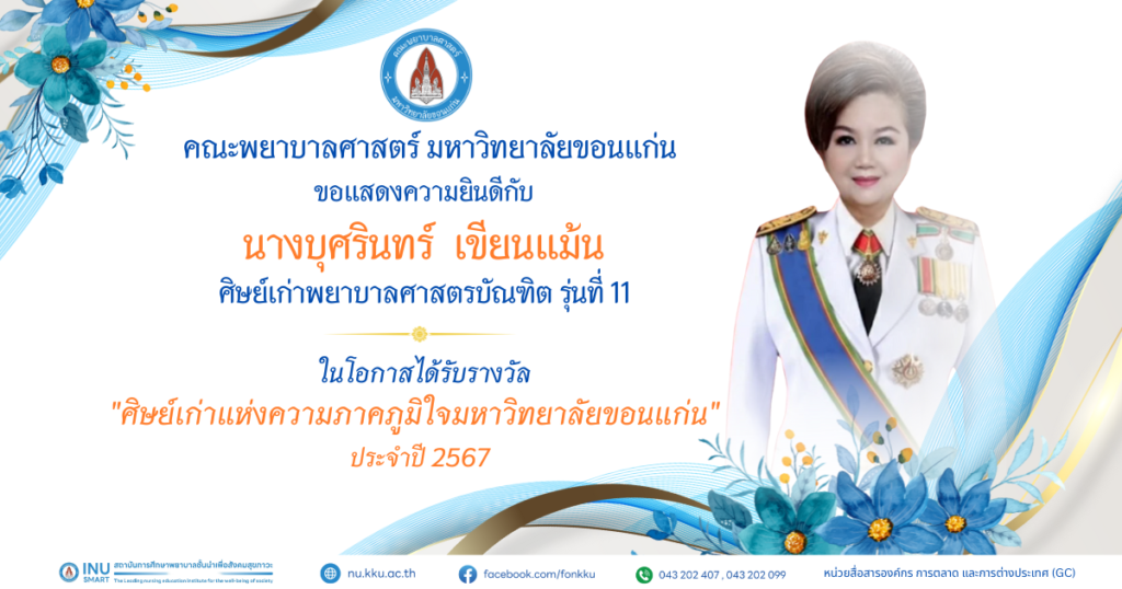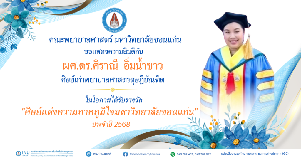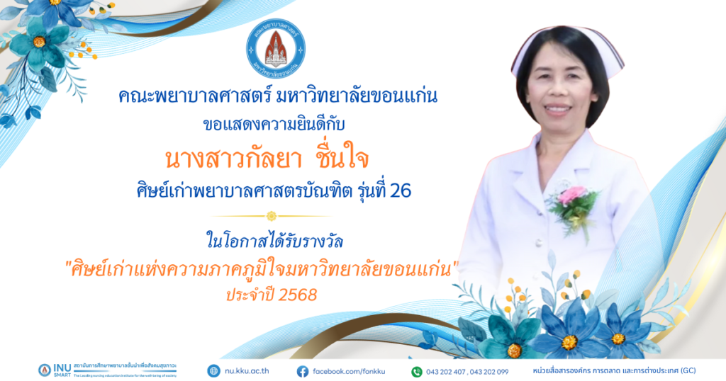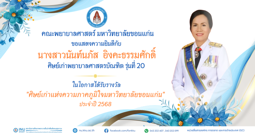 คณะพยาบาลศาสตร์ มหาวิทยาลัยขอนแก่น ขอแสดงความยินดีกับผู้ได้รับรางวัล ศิษย์เก่าดีเด่น ประจำปี พ.ศ. 2568 และ รางวัลศิษย์เก่าแห่งความภาคภูมิใจ มหาวิทยาลัยขอนแก่น ประจำปี พ.ศ. 2567 และประจำปี พ.ศ. 2568