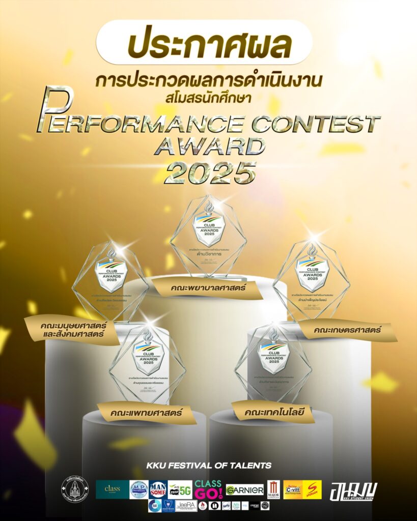 คณะพยาบาลศาสตร์ มหาวิทยาลัยขอนแก่น ขอแสดงความชื่นชมยินดีอย่างยิ่งกับ สโมสรนักศึกษาคณะพยาบาลศาสตร์ ในโอกาสที่สร้างชื่อเสียงและความภาคภูมิใจให้กับคณะฯ โดยการคว้ารางวัลชนะเลิศ “ด้านวิชาการ” จากการประกวดผลการดำเนินงานสโมสรนักศึกษา (Performance Contest Award 2025) ซึ่งจัดโดยองค์การนักศึกษา มหาวิทยาลัยขอนแก่น