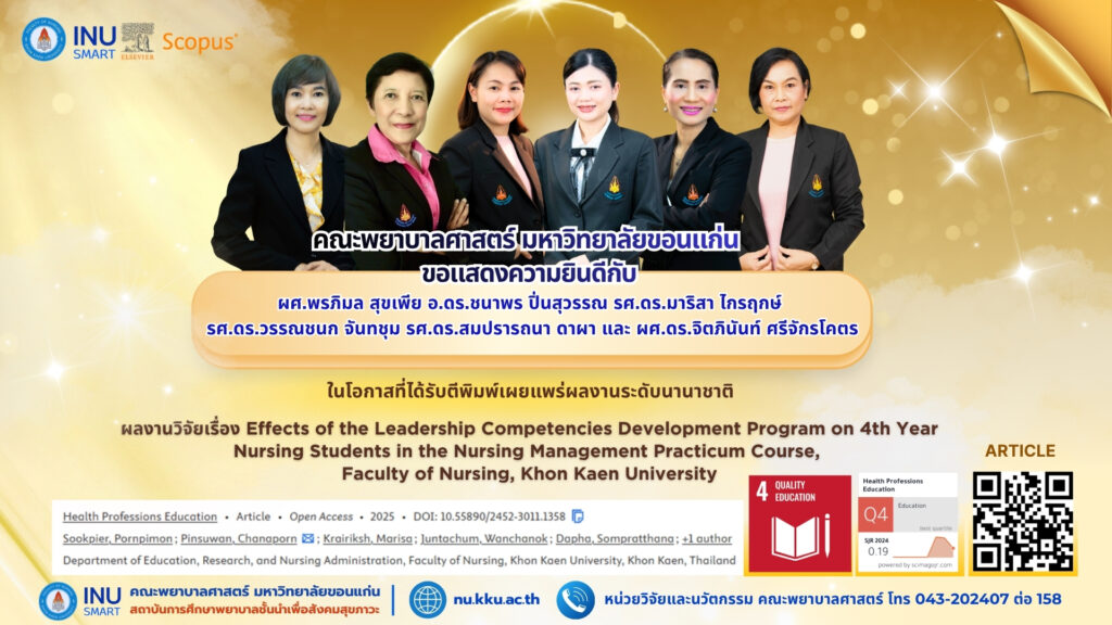 ผลงานวิจัยเรื่อง “Effects of the Leadership Competencies Development Program on 4th Year Nursing Students in the Nursing Management Practicum Course, Faculty of Nursing, Khon Kaen University”