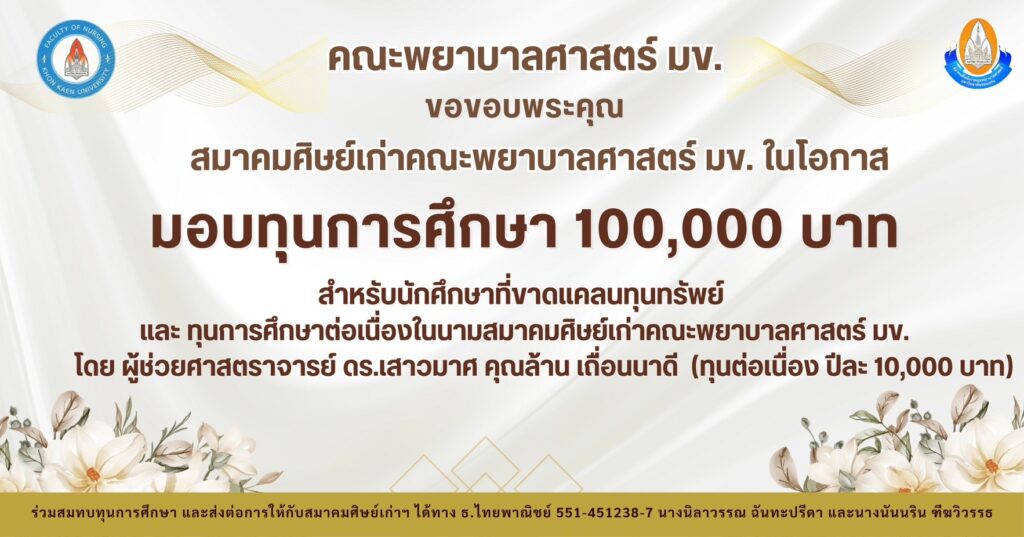 คณะพยาบาลศาสตร์ มหาวิทยาลัยขอนแก่น ขอขอบพระคุณ สมาคมศิษย์เก่าคณะพยาบาลศาสตร์ มหาวิทยาลัยขอนแก่น ในโอกาสมอบทุนการศึกษา จำนวน 100,000 บาท เพื่อสนับสนุนการศึกษาของนักศึกษาที่ขาดแคลนทุนทรัพย์ ตลอดจนทุนการศึกษาต่อเนื่องในนามสมาคมศิษย์เก่า