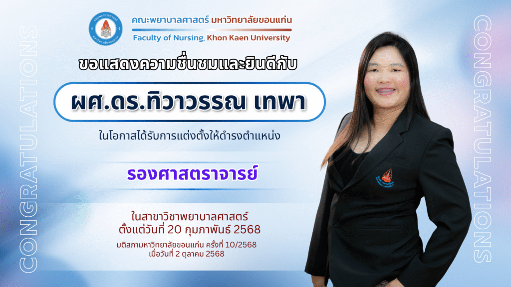 “รองศาสตราจารย์” ในสาขาวิชาพยาบาลศาสตร์ ตั้งแต่วันที่ 20 กุมภาพันธ์ 2568 มติสภามหาวิทยาลัยขอนแก่น ครั้งที่ 10/2568