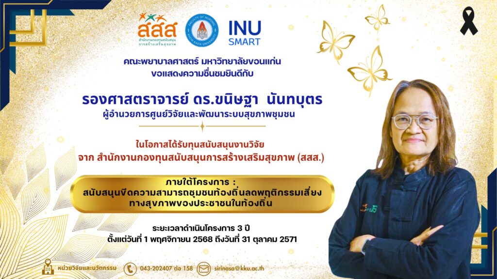 คณะพยาบาลศาสตร์ มหาวิทยาลัยขอนแก่น ขอแสดงความยินดีกับ รองศาสตราจารย์ ดร.ขนิษฐา นันทบุตร ผู้อำนวยการศูนย์วิจัยและพัฒนาระบบสุขภาพชุมชน ในโอกาสได้รับ ทุนสนับสนุนงานวิจัยจากสำนักงานกองทุนสนับสนุนการสร้างเสริมสุขภาพ (สสส.)