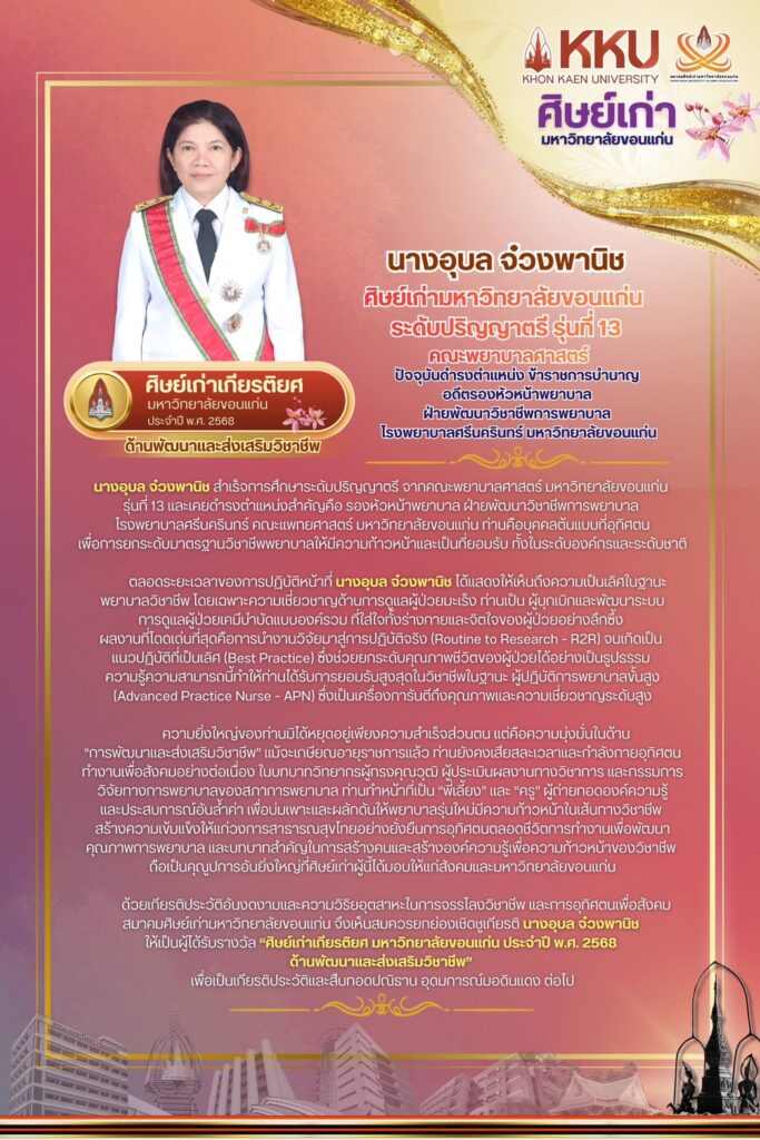 คณะพยาบาลศาสตร์ มหาวิทยาลัยขอนแก่น ขอแสดงความยินดีกับ นางอุบล จ๋วงพานิช ศิษย์เก่าคณะพยาบาลศาสตร์ รุ่นที่ 6 (KKU 13) ข้าราชการบำนาญ อดีตรองหัวหน้าพยาบาลฝ่ายพัฒนาวิชาชีพการพยาบาล โรงพยาบาลศรีนครินทร์ มหาวิทยาลัยขอนแก่น ในโอกาสได้รับ “รางวัลศิษย์เก่าเกียรติยศ ด้านพัฒนาและส่งเสริมวิชาชีพ ประจำปี 2568”จากสมาคมศิษย์เก่ามหาวิทยาลัยขอนแก่น ซึ่งนับเป็นความภาคภูมิใจของคณะพยาบาลศาสตร์และมหาวิทยาลัยขอนแก่น