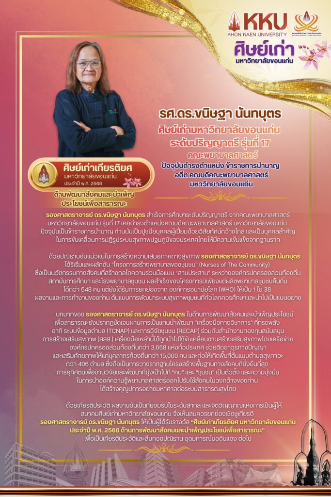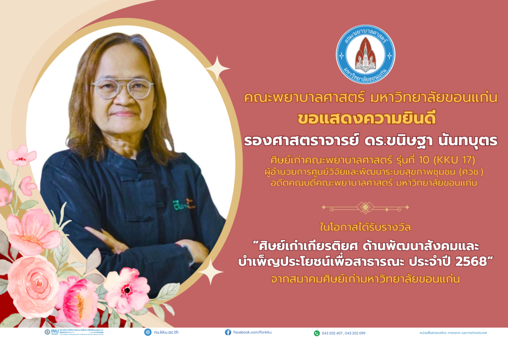 คณะพยาบาลศาสตร์ มหาวิทยาลัยขอนแก่น ขอแสดงความยินดีกับ รองศาสตราจารย์ ดร.ขนิษฐา นันทบุตร ศิษย์เก่าคณะพยาบาลศาสตร์ รุ่นที่ 10 (KKU 17) ผู้อำนวยการศูนย์วิจัยและพัฒนาระบบสุขภาพชุมชน (ศวช.) อดีตคณบดีคณะพยาบาลศาสตร์ มหาวิทยาลัยขอนแก่น ในโอกาสได้รับ “รางวัลศิษย์เก่าเกียรติยศ ด้านพัฒนาสังคมและบำเพ็ญประโยชน์เพื่อสาธารณะ ประจำปี 2568” จากสมาคมศิษย์เก่ามหาวิทยาลัยขอนแก่น