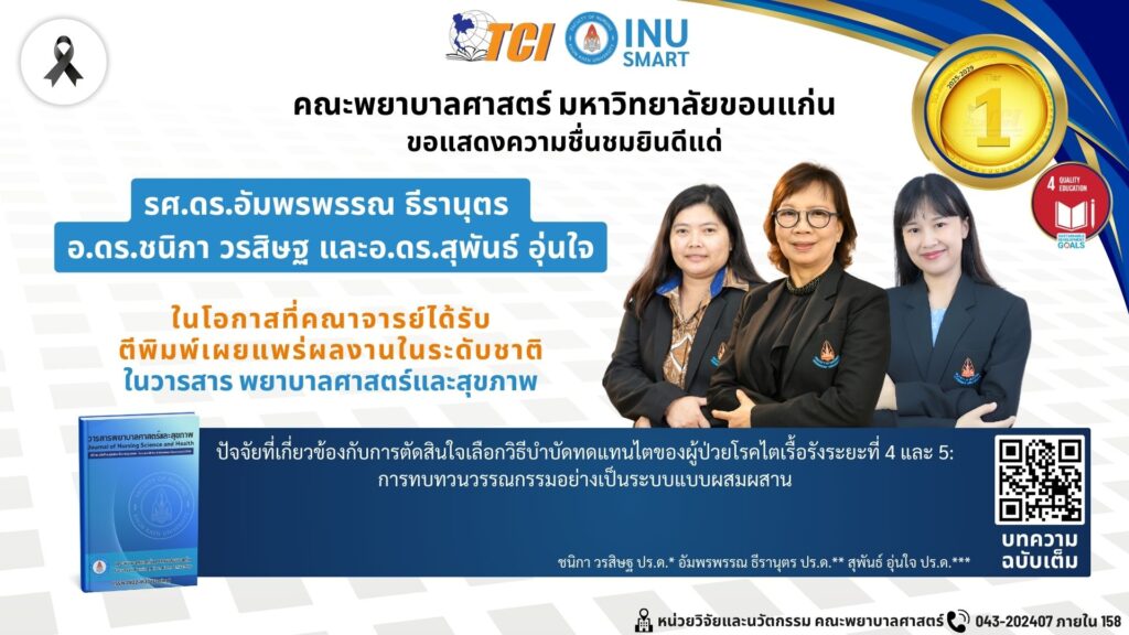 คณะพยาบาลศาสตร์ มหาวิทยาลัยขอนแก่น ขอแสดงความยินดีแก่รองศาสตราจารย์ ดร.อัมพรพรรณ ธีรานุตร, อาจารย์ ดร.ชนิกา วรสิษฐ, อาจารย์ ดร.สุพันธ์ อุ่นใจ