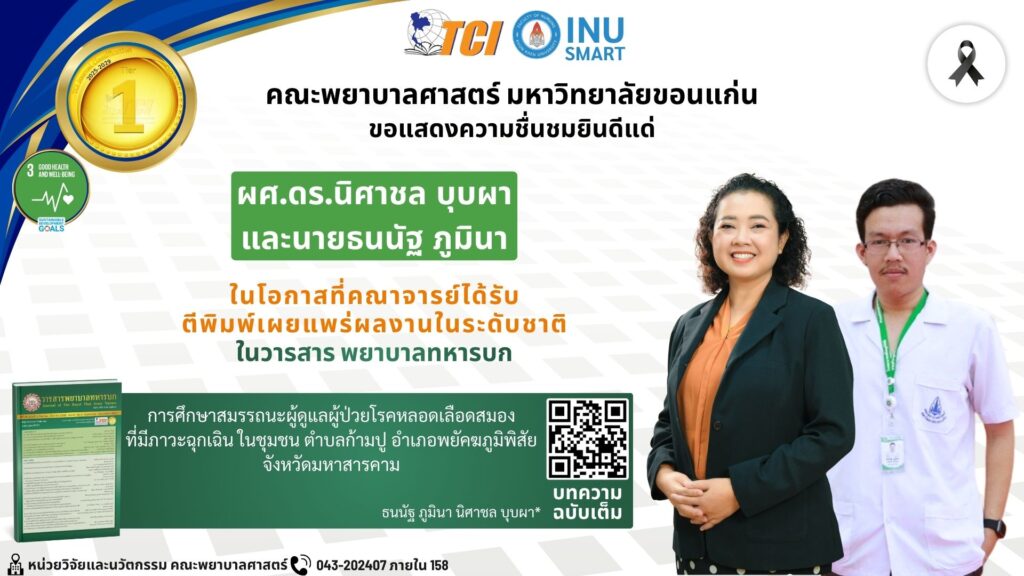 คณะพยาบาลศาสตร์ มหาวิทยาลัยขอนแก่น ขอแสดงความชื่นชมยินดีแก่ ผู้ช่วยศาสตราจารย์ ดร.นิศาชล บุบผา และ นายธนัฐ ภูมินา ในโอกาสที่ผลงานวิจัยได้รับการตีพิมพ์เผยแพร่ในระดับชาติ ใน วารสารพยาบาลทหารบก ผลงานวิจัยเรื่อง “การศึกษาสมรรถนะผู้ดูแลผู้ป่วยโรคหลอดเลือดสมองที่มีภาวะฉุกเฉินในชุมชน ตำบลก้ามปู อำเภอพยัคฆภูมิพิสัย จังหวัดมหาสารคาม”