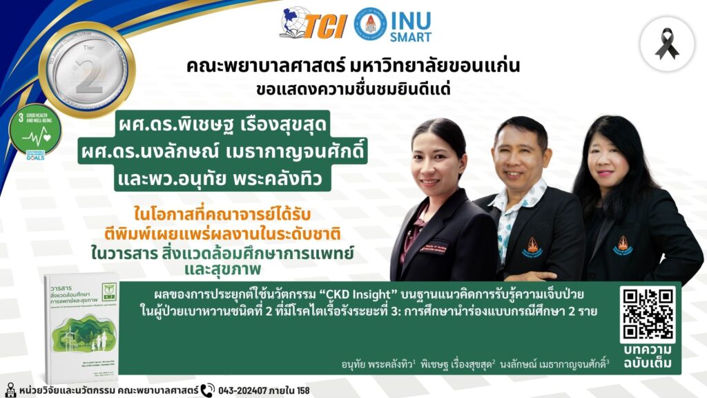 ในโอกาสที่ผลงานวิชาการได้รับการตีพิมพ์เผยแพร่ในระดับชาติ ในวารสาร สิ่งแวดล้อมศึกษาการแพทย์และสุขภาพ เรื่อง ผลของการประยุกต์ใช้นวัตกรรม “CKD Insight” บนฐานแนวคิดการรับรู้ความเจ็บป่วยในผู้ป่วยเบาหวานชนิดที่ 2 ที่มีโรคไตเรื้อรังระยะที่ 3 : การศึกษานำร่องแบบกรณีศึกษา 2ราย ซึ่งเป็นผลงานที่สะท้อนถึงความเชี่ยวชาญทางวิชาการและการประยุกต์ใช้นวัตกรรมด้านการพยาบาลเพื่อส่งเสริมคุณภาพชีวิตและสุขภาวะของประชาชน