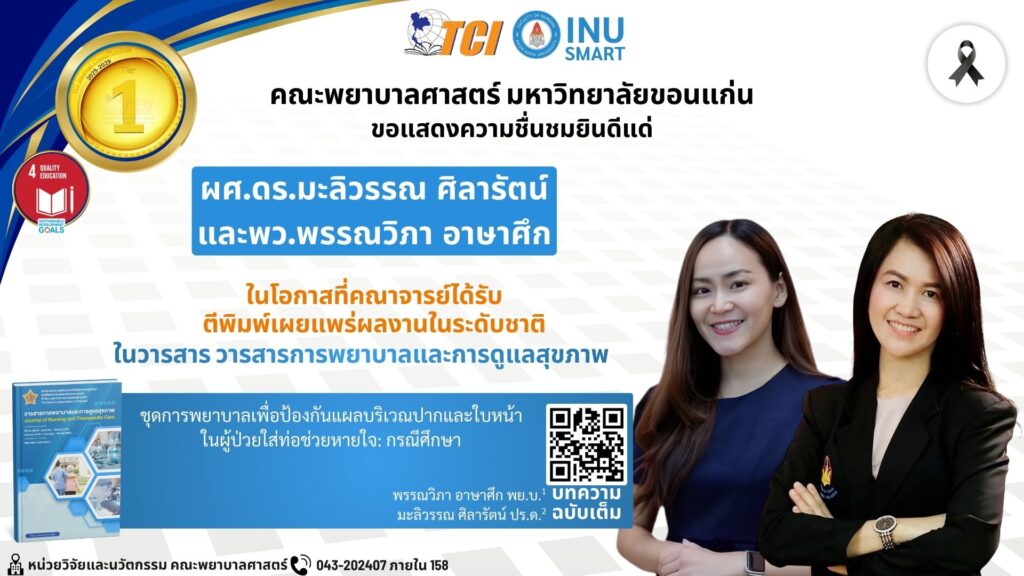 ในโอกาสที่ผลงานวิจัยเชิงวิชาการได้รับการตีพิมพ์เผยแพร่ในวารสารระดับชาติที่มีคุณภาพ ผลงานวิจัยดังกล่าวได้รับการตีพิมพ์ใน วารสารการพยาบาลและการดูแลสุขภาพ (Journal of Nursing and Therapeutic Care) ซึ่งเป็นวารสารที่ผ่านการรับรองคุณภาพจาก TCI (Thai-Journal Citation Index Centre) ระดับ Tier 1 ประจำปี พ.ศ. 2568–2572 โดยมีรายละเอียดผลงานดังนี้