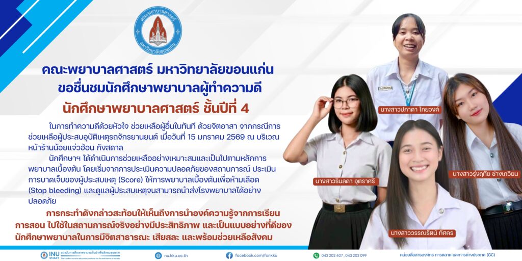 คณะพยาบาลศาสตร์ มหาวิทยาลัยขอนแก่น ขอชื่นชมนักศึกษาพยาบาลผู้ทำความดี นักศึกษาพยาบาลศาสตร์ ชั้นปีที่ 4