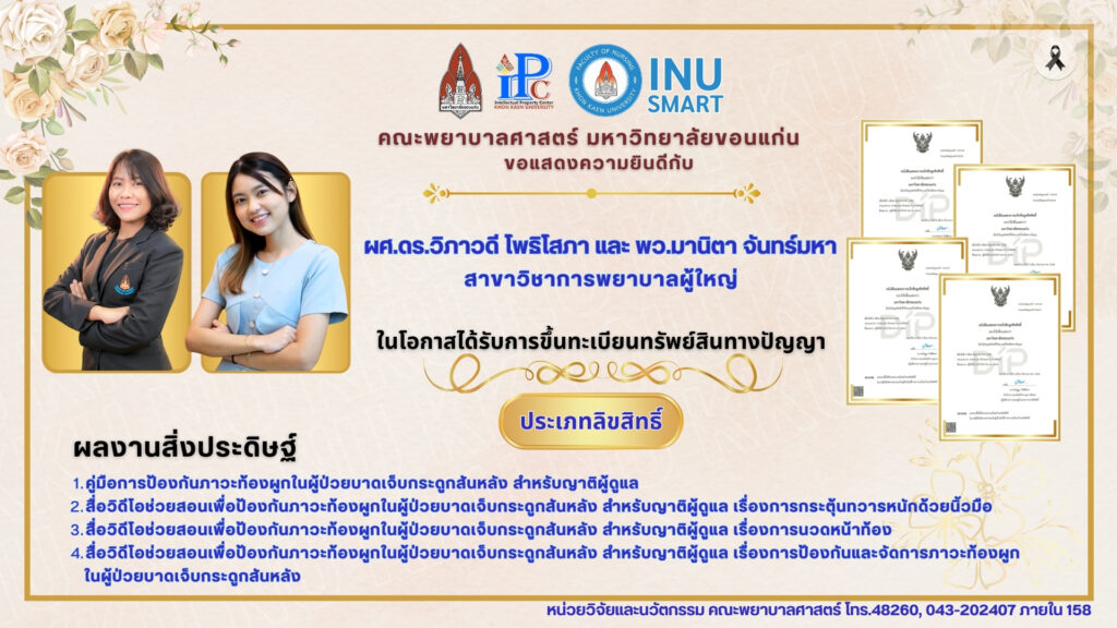 คณะพยาบาลศาสตร์ มหาวิทยาลัยขอนแก่น ขอแสดงความยินดีกับ ผศ.ดร.วิภาวดี โพธิโสภา และ พว.มานิตา จันทร์มหา