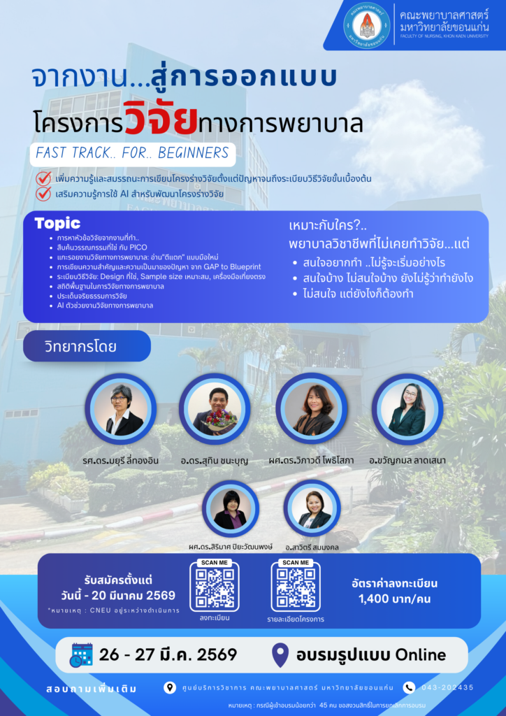 📞 สอบถามเพิ่มเติม: ศูนย์บริการวิชาการ คณะพยาบาลศาสตร์ ม.ขอนแก่น