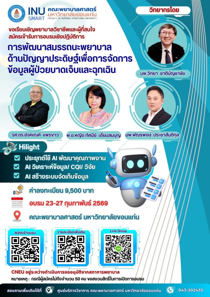 📢 คณะพยาบาลศาสตร์ มหาวิทยาลัยขอนแก่น ขอเชิญชวน พยาบาลวิชาชีพและผู้สนใจเข้าร่วมโครงการอบรมเชิงปฏิบัติการ “การพัฒนาสมรรถนะพยาบาลด้านปัญญาประดิษฐ์เพื่อการจัดการข้อมูลผู้ป่วยบาดเจ็บและฉุกเฉิน”