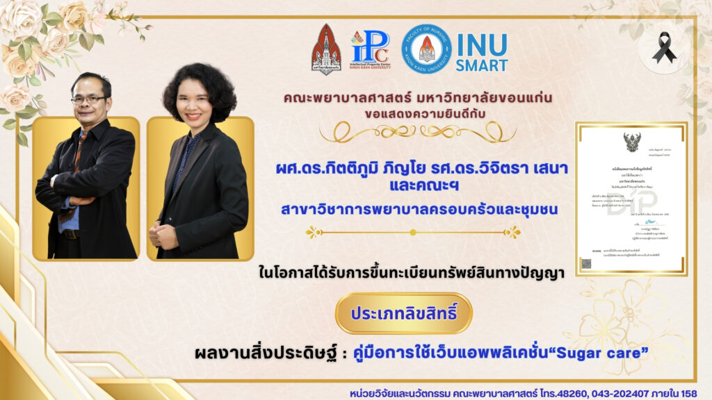 คณะพยาบาลศาสตร์ มหาวิทยาลัยขอนแก่น ขอแสดงความยินดีกับ ผศ.ดร.ชนกฤทัย ชื่นอารมณ์ และ อ.ดร.จุไรพร สัมพุทธานนท์ และคณะฯ